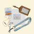 kit includes: canvas, threads, Proj bag, needles, scissors & lanyard, needle threader, self finishing leather luggage tag & instructions